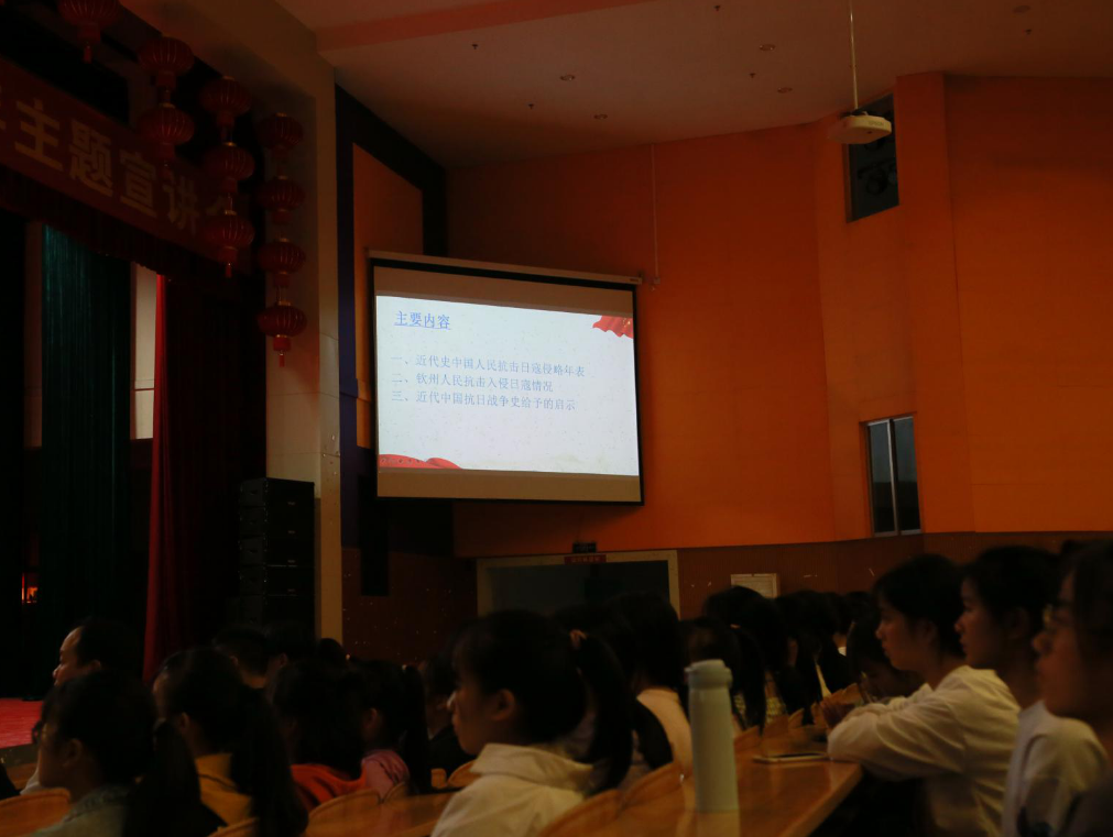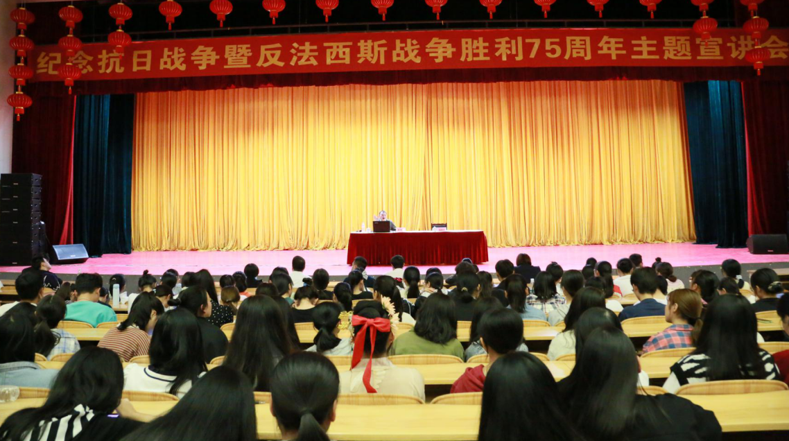 为庆祝中国人民抗日战争暨世界反法西斯战争胜利75周年,进一步激发广大青年学子爱党爱国热情,10月22日晚,我校在图书馆三楼报告厅举行纪念抗日战争暨世界反法西斯战胜利75周年主题宣讲会。宣讲会邀请到中共钦州市委党史研究室李明奎主任主讲。学校党员代表、教师及学生800余人到场聆听宣讲。