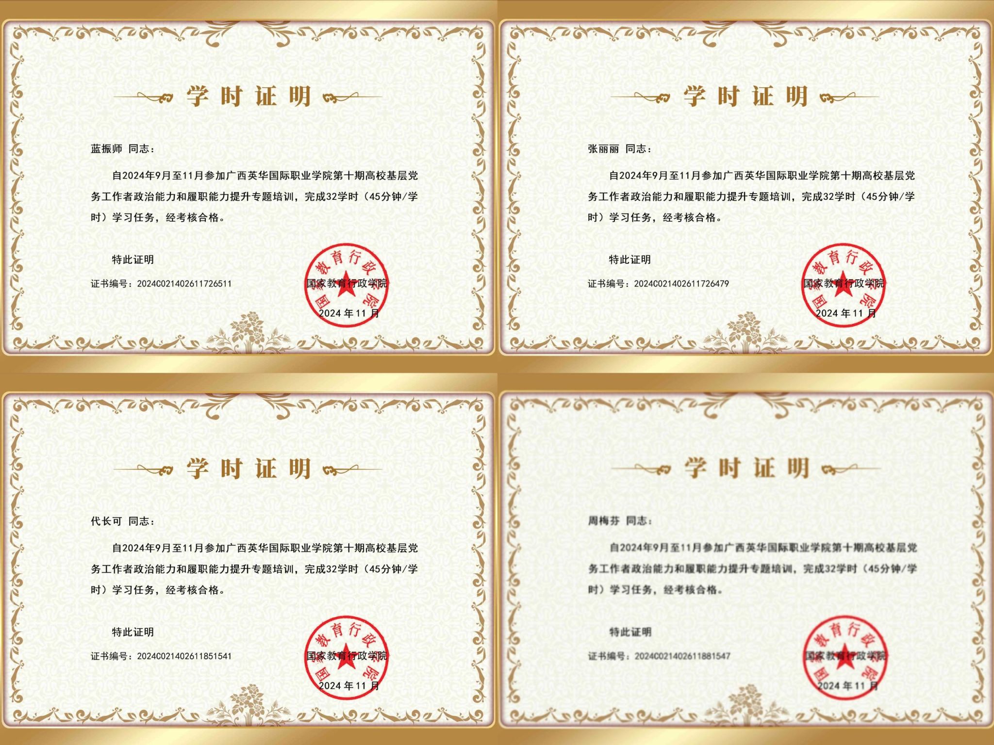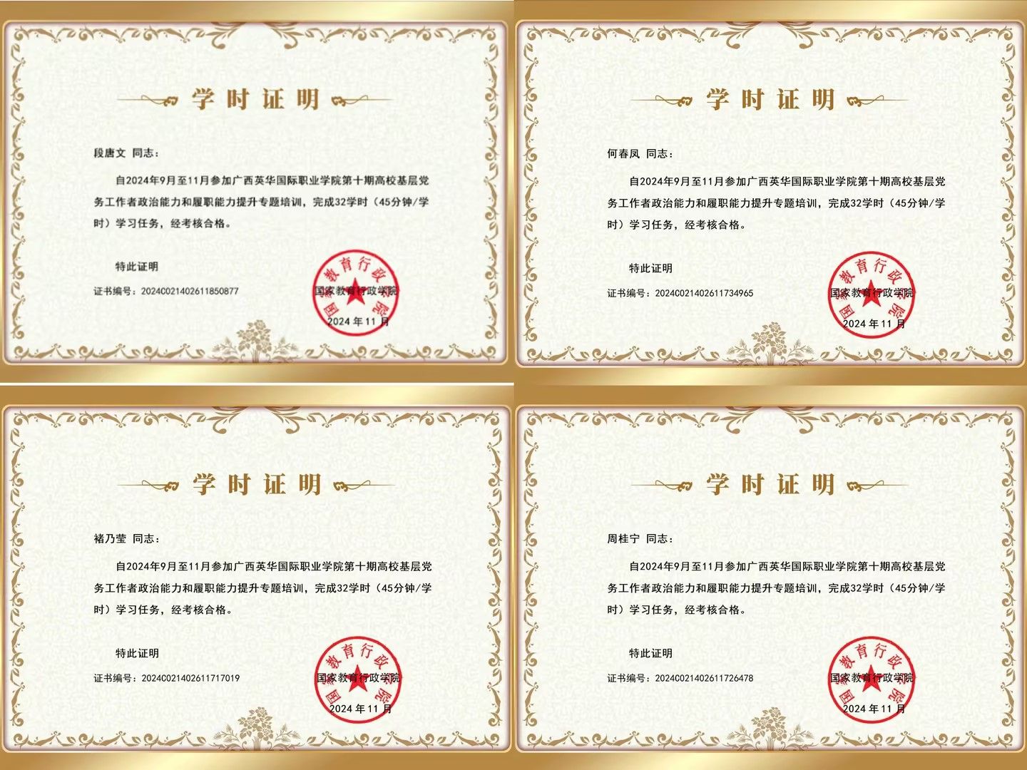 为深入贯彻习近平新时代中国特色社会主义思想,深入学习贯彻党的二十大和二十届二中、三中全会精神,认真学习贯彻习近平总书记关于党的建设的重要思想,加强和改进高校党的建设工作,进一步推动党建工作和业务工作在融合发展中相互促进,2024年9月-11月,广西英华国际职业学院开展第十期基层党务工作者政治能力和履职能力提升网络培训班。