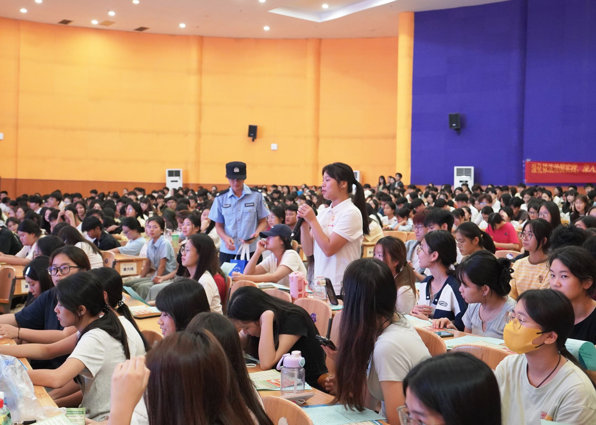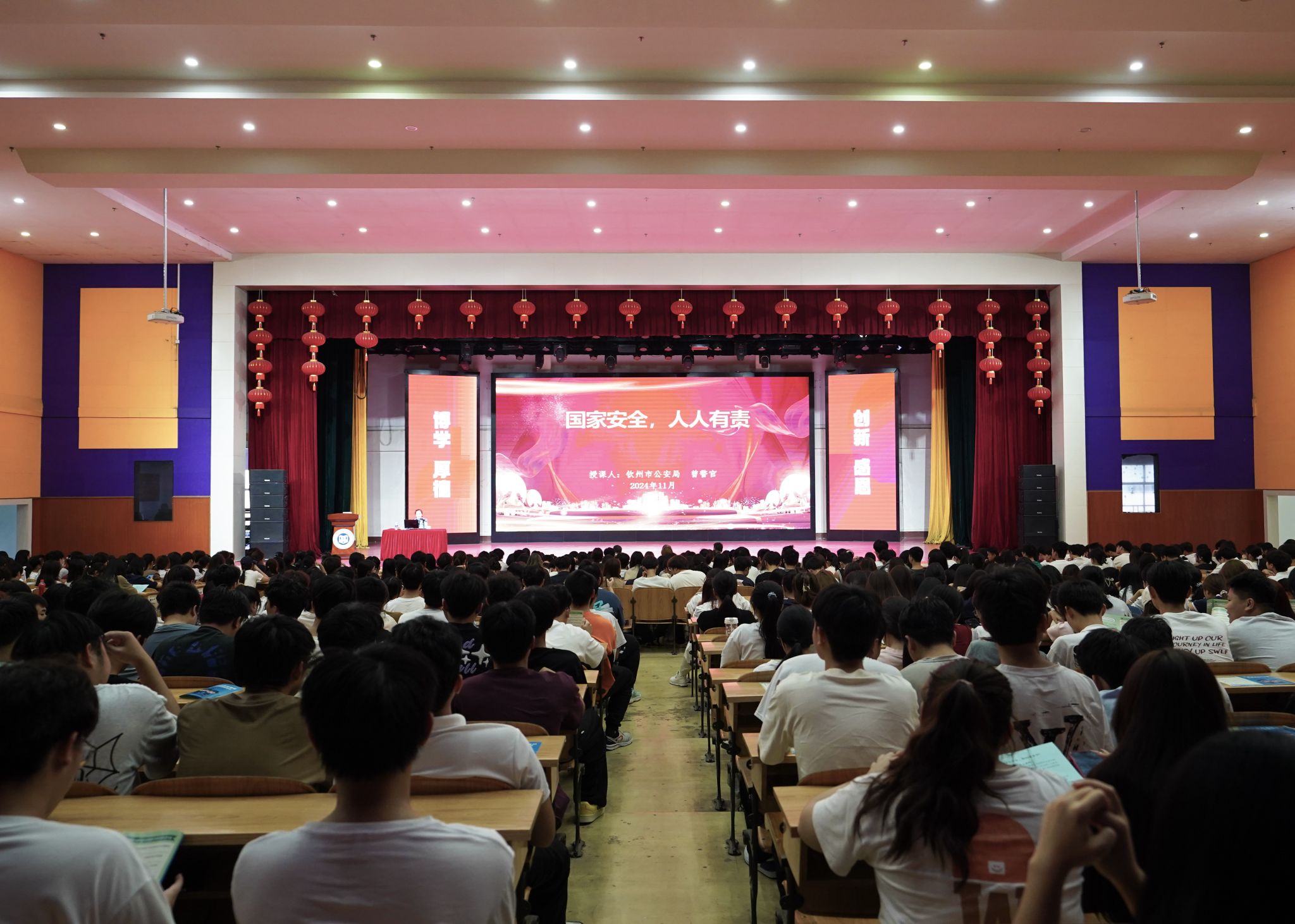 国家安全是中国式现代化行稳致远的重要基础。为进一步增强大学生国家安全意识,深入学习党的二十届三中全会精神,培养新时代青年的责任感和使命感,我校于11月13日下午在图书馆报告厅举办了“国家安全 人人有责”国家安全教育专题讲座,特邀钦州市公安局境外非政府组织管理办公室、钦州市警察协会特聘教官曾警官担任主讲嘉宾,学校全体辅导员、学生处、团委、保卫处负责同志和学生代表共计700多人参加讲座。