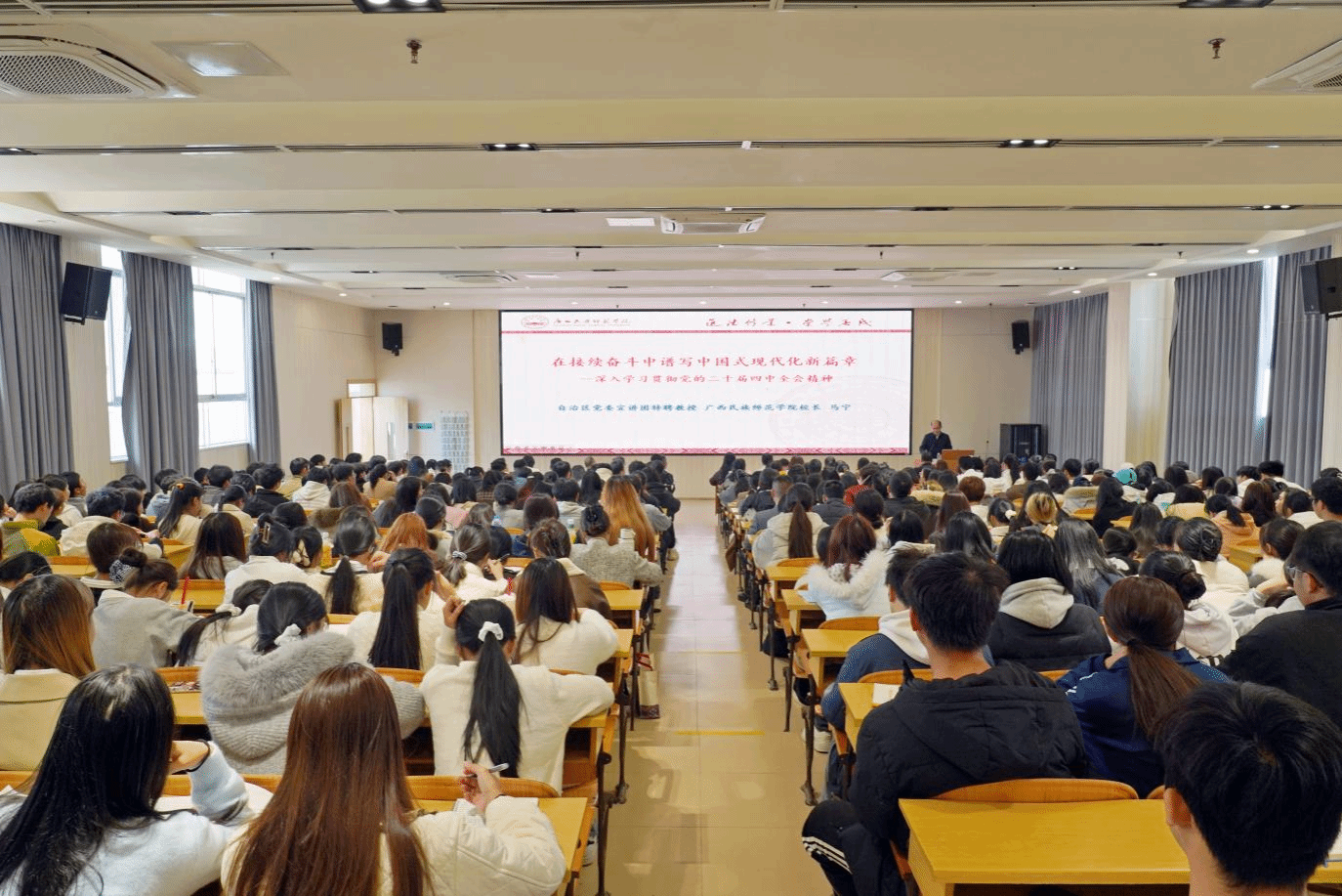 1月8日下午,我校在践行楼举行学习贯彻党的二十届四中全会精神广西高校宣讲报告会。自治区党委讲师团特聘教授(专家)、广西民族师范学院党委副书记、校长马宁教授作专题宣讲报告。学校党委书记、政府督导专员黄家良主持报告会。