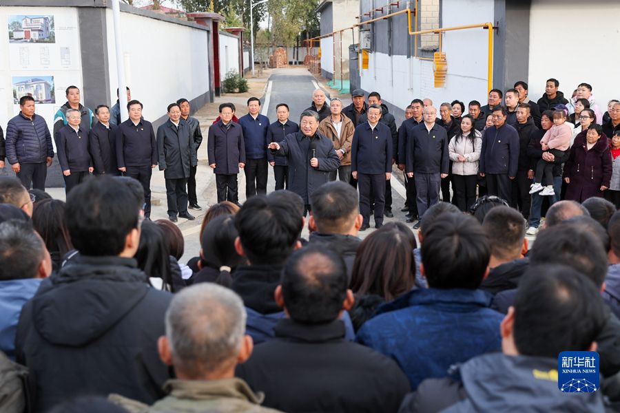 11月10日,中共中央总书记、国家主席、中央军委主席习近平在北京、河北考察灾后恢复重建工作。这是10日下午,习近平在河北保定涿州市刁窝镇万全庄村考察时,同村民们亲切交流。新华社发(盛佳鹏摄)