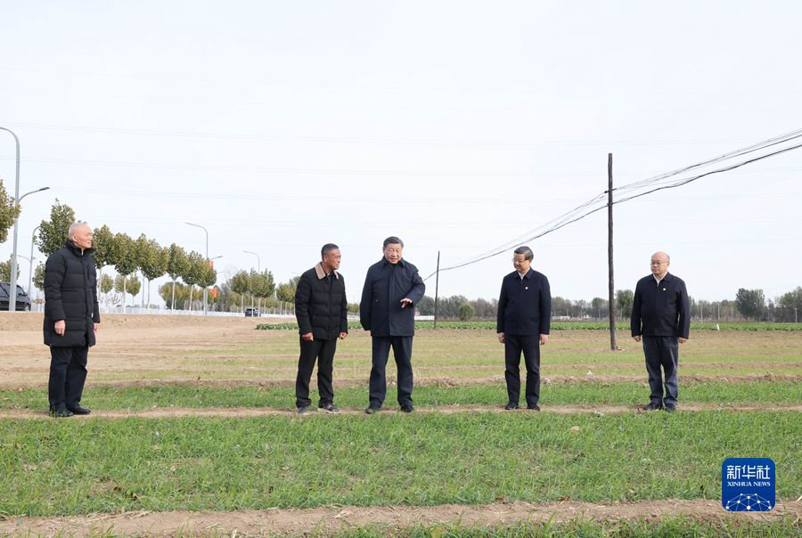 11月10日,中共中央总书记、国家主席、中央军委主席习近平在北京、河北考察灾后恢复重建工作。这是10日下午,习近平在河北保定涿州市刁窝镇万全庄村村边农田察看冬小麦长势。新华社记者 王晔 摄