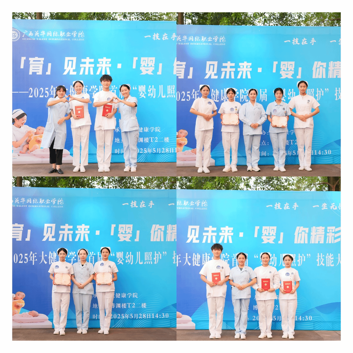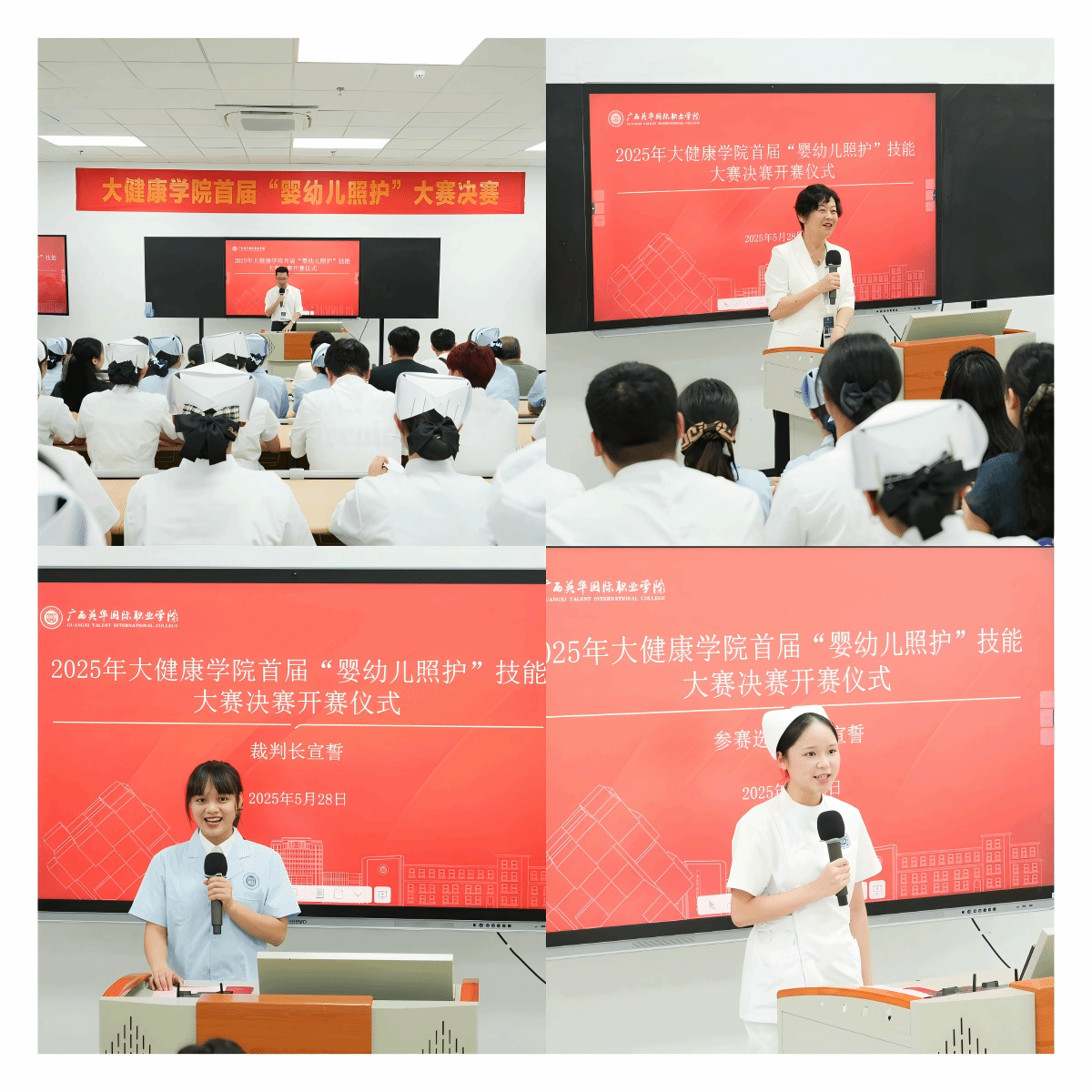 2025年5月28日,广西英华国际职业学院大健康学院首届婴幼儿照护技能大赛决赛在博渊楼(T2)实训室顺利举行。本次大赛以“以赛促学、以赛促练、突出技能、展示风采、促进就业”为主题,旨在检验学生专业技能水平,培养兼具实践能力与人文关怀的护理人才,推动学院“岗课赛证”融合与实践教学改革。