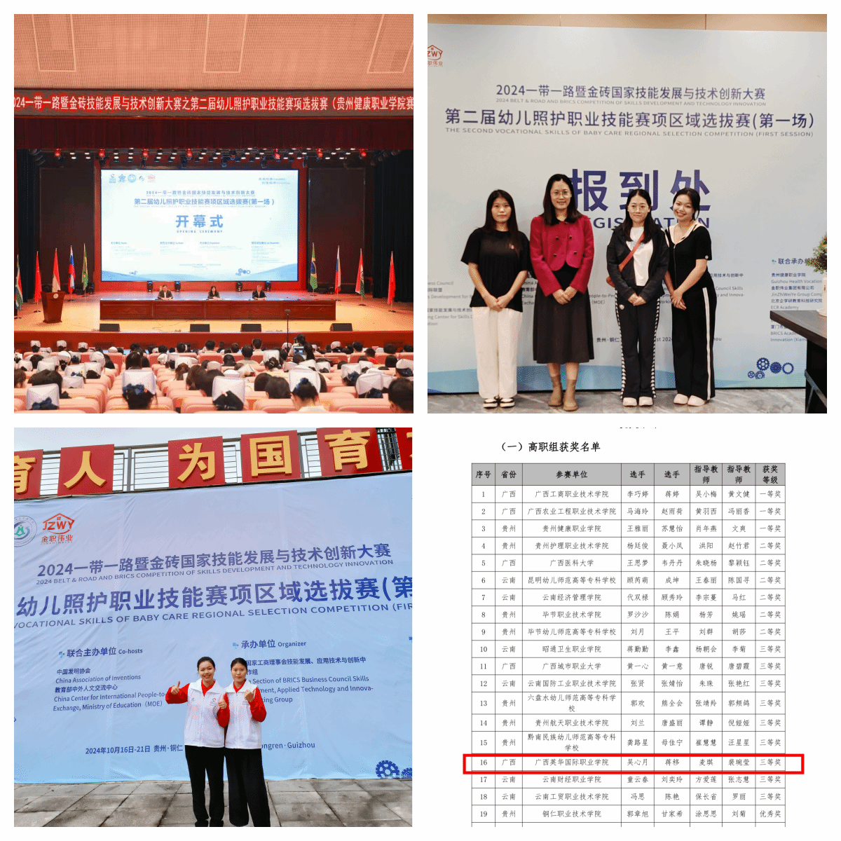 近日2024年一带一路暨金砖国家技能发展与技术创新大赛之第二届婴幼儿照护职业技能赛项区域选拔赛,在贵州健康职业学院顺利开赛。来自贵州、广西、云南地区的30支代表队60余名选手同台竞技。我校大健康学院麦琪老师和教育学院裴琬莹老师指导吴心月和蒋移同学参赛。经过三天的激烈角逐,两位参赛选手取得三等奖的佳绩