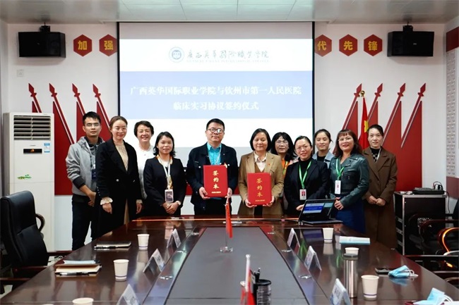12月13日下午,“广西英华国际职业学院-钦州市第一人民医院学生临床实习合作签约仪式”在我校举行。我校校长邹利斌、校长助理叶春珍,第一人民医院党委书记潘志坚、党政办主任张小艳及双方相关部门负责人出席签约仪式。邹利斌、潘志坚代表双方正式签署合作协议。