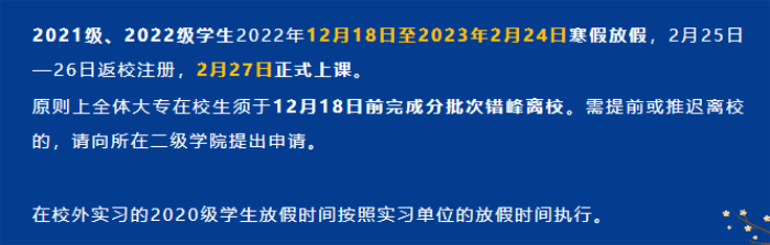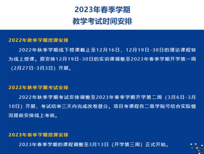 根据当前新冠疫情防控形势变化,为切实保障我校师生员工健康安全,经学校研究,现就调整我校2022年秋季学期期末教学和考试工作安排等有关事项通知如下: