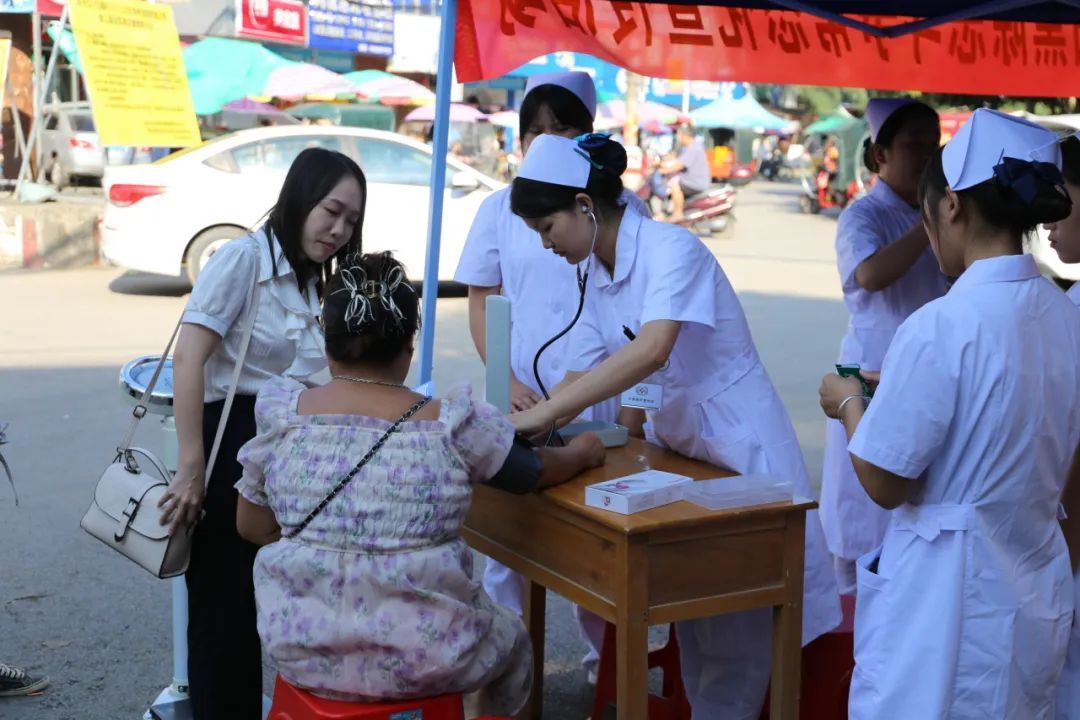 上午9时,由护理协会组成的义诊小队在当地政府工作人员的协助下开展现场义诊及健康知识宣传活动,其中包含测量血压、测量呼吸脉搏、身高、体重等健康检测,以及新生儿抚触,幼儿海姆立克急救法,成人心肺复苏等急救技能展示。