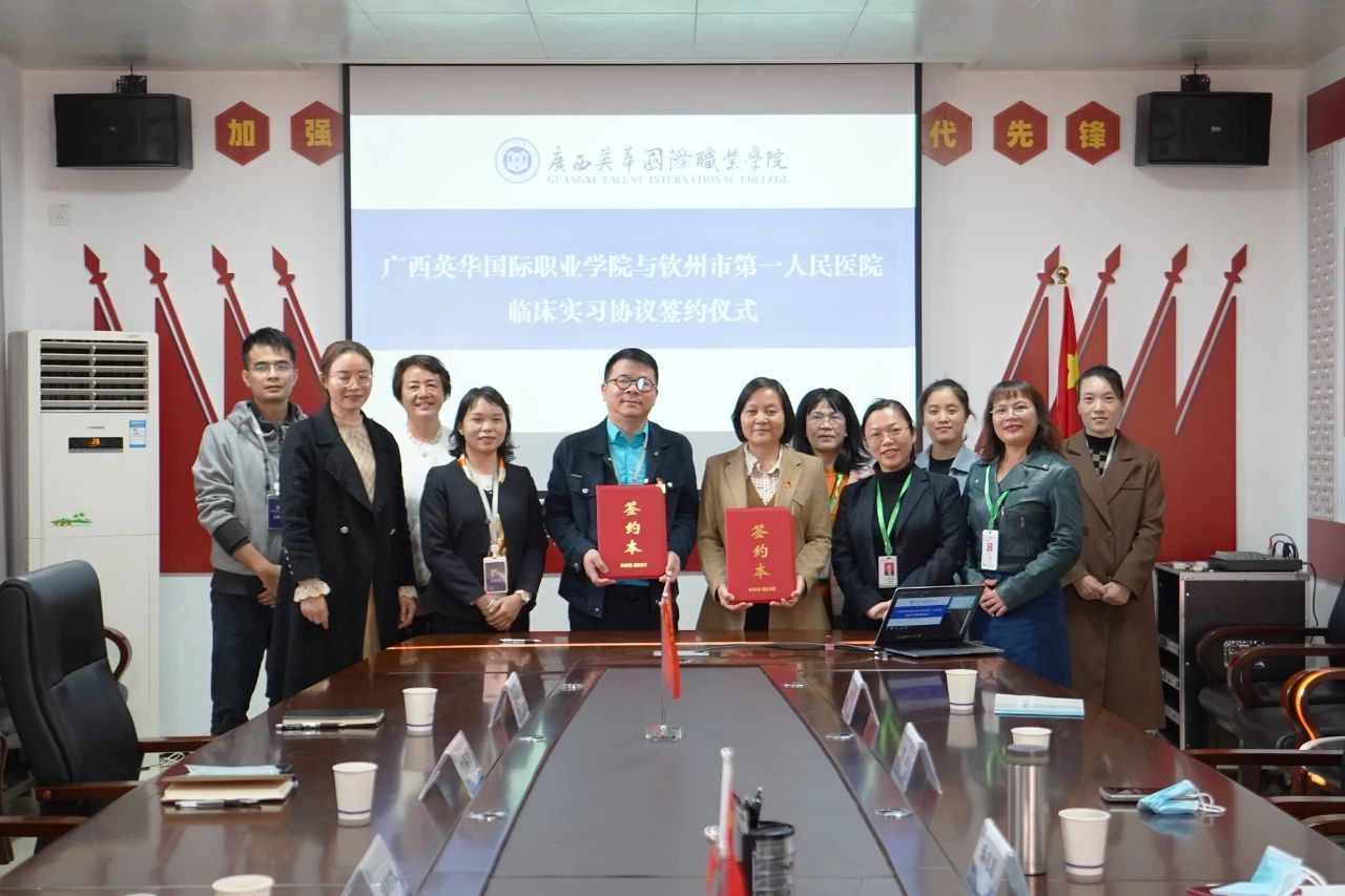12月13日下午,“广西英华国际职业学院-钦州市第一人民医院学生临床实习合作签约仪式”在我校举行。我校校长邹利斌、校长助理叶春珍,第一人民医院党委书记潘志坚、党政办主任张小艳及双方相关部门负责人出席签约仪式。邹利斌、潘志坚代表双方正式签署合作协议。