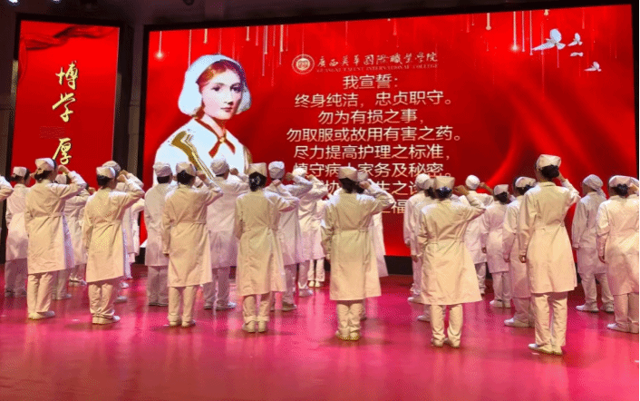 随后,柴新卫副校长勉励护理学子增强自身的使命感和责任感,在工作岗位上脚踏实地,兢兢业业,为护理事业的发展做出新的更大贡献。教师代表陆远英、学生代表刘连梅纷纷发言,陆远英老师勉励护理学子积极进取、钻研医术,以仁心仁术对待患者,表达了对护理学子的殷切期望。学生代表刘连梅说,愿在艰苦奋斗中磨砺意志品质、在救死扶伤的岗位上拼搏进取,不负青春,不负韶华。
