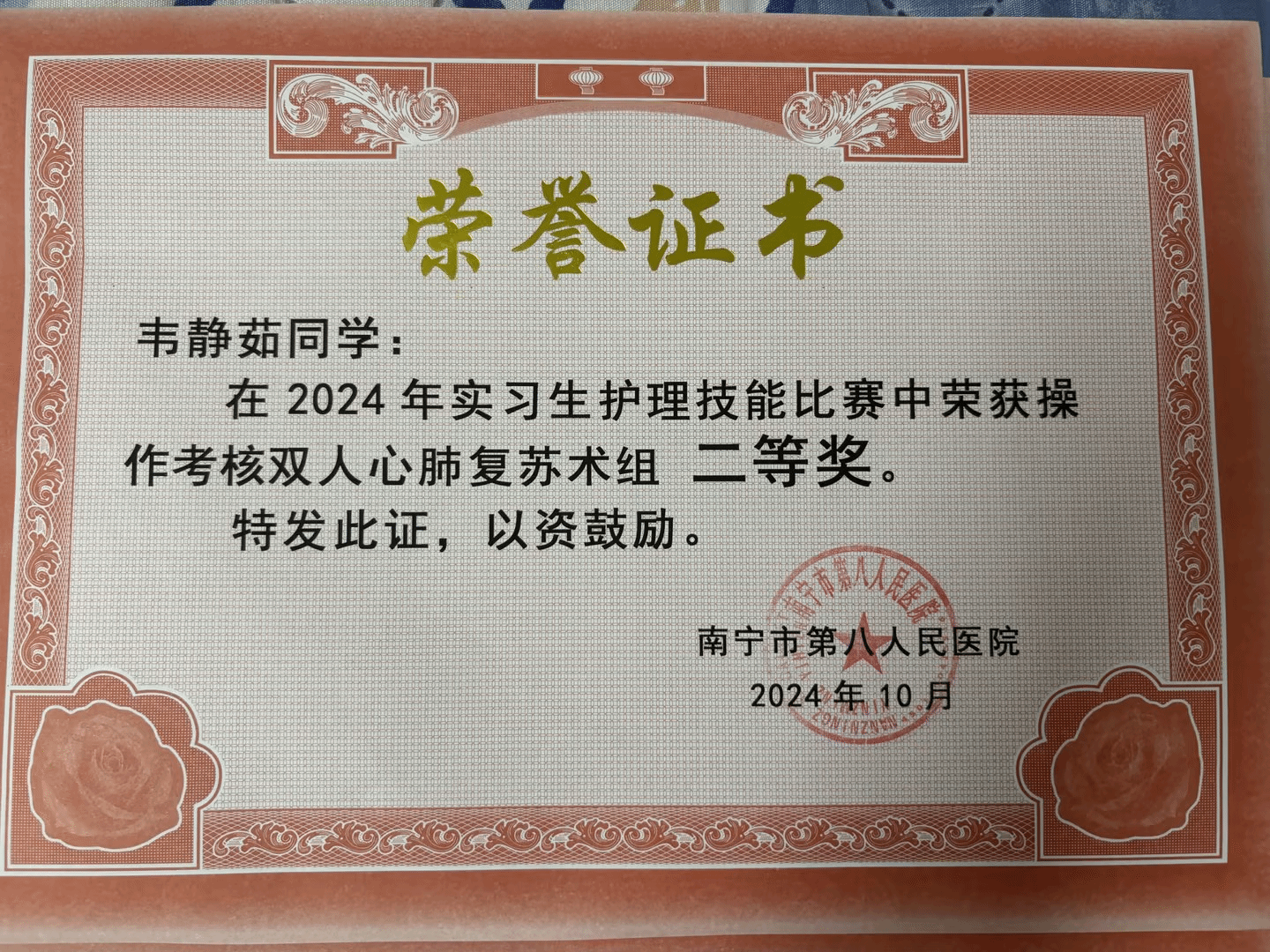 近期,大健康学院2022级实习生在实习单位中展现出精湛的专业技能,赢得医院的一直好评。其中,韦静茹同学在南宁市第八人民医院组织的实习生护理技能大赛中荣获双人心肺复苏术项目二等奖的好成绩。