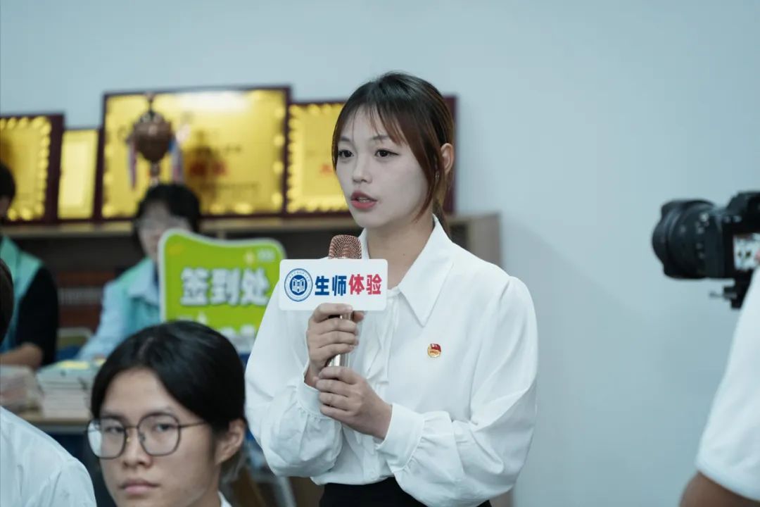 学生“记者”积极提问、踊跃发言,“我建议优化一下课程安排、能增加勤工助学岗位吗?、社团活动能否有更多的支持?”。一件件学生关心的学习生活事项被“记者”代表们诚挚提出也得到了回应和解答。