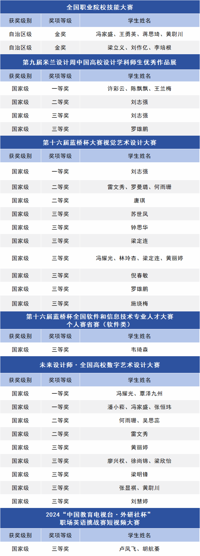 这一年,我校在广西职业院校技能大赛(高职组)中斩获金奖2项,在教育部认可的84项比赛中,累计摘得国家级奖项25,自治区及奖项167项。其中国家级奖项一等奖4项、二等奖5项、三等奖16项。从艺术设计到信息技术,从职场英语到医疗健康,获奖赛事涵盖多个领域,学子们在国赛舞台上展现英华风采,用技能实力书写学生成长答卷。