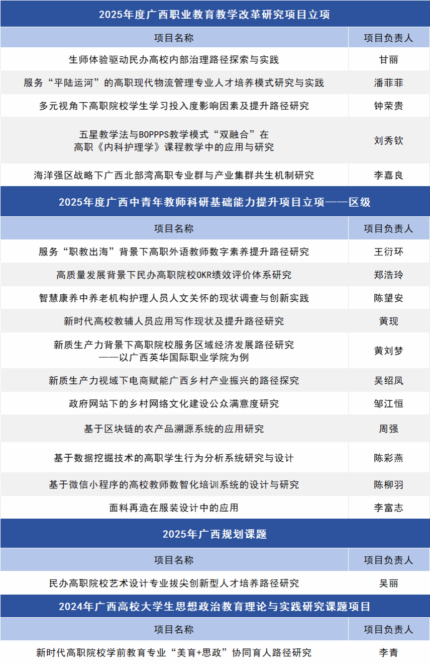 这一年,我校科研工作实现质效双升,《广西职业教育教学改革研究项目》与《广西中青年教师科研基础能力提升项目》立项通过率达100% 。本学年共立项自治区级课题18项,其中《广西职业教育教学改革研究项目》立项5项、《广西中青年教师科研基础能力提升项目》立项11项、《广西教育科学规划课题》1项、《广西高校大学生思想政治教育理论与实践研究课题项目》1项。教师参与科研的热忱持续攀升,课题研究聚焦教学模式创新、区域产业人才培养、教育教学改革等关键问题,为学校教学质量提升提供了有力的理论支撑和实践指导。