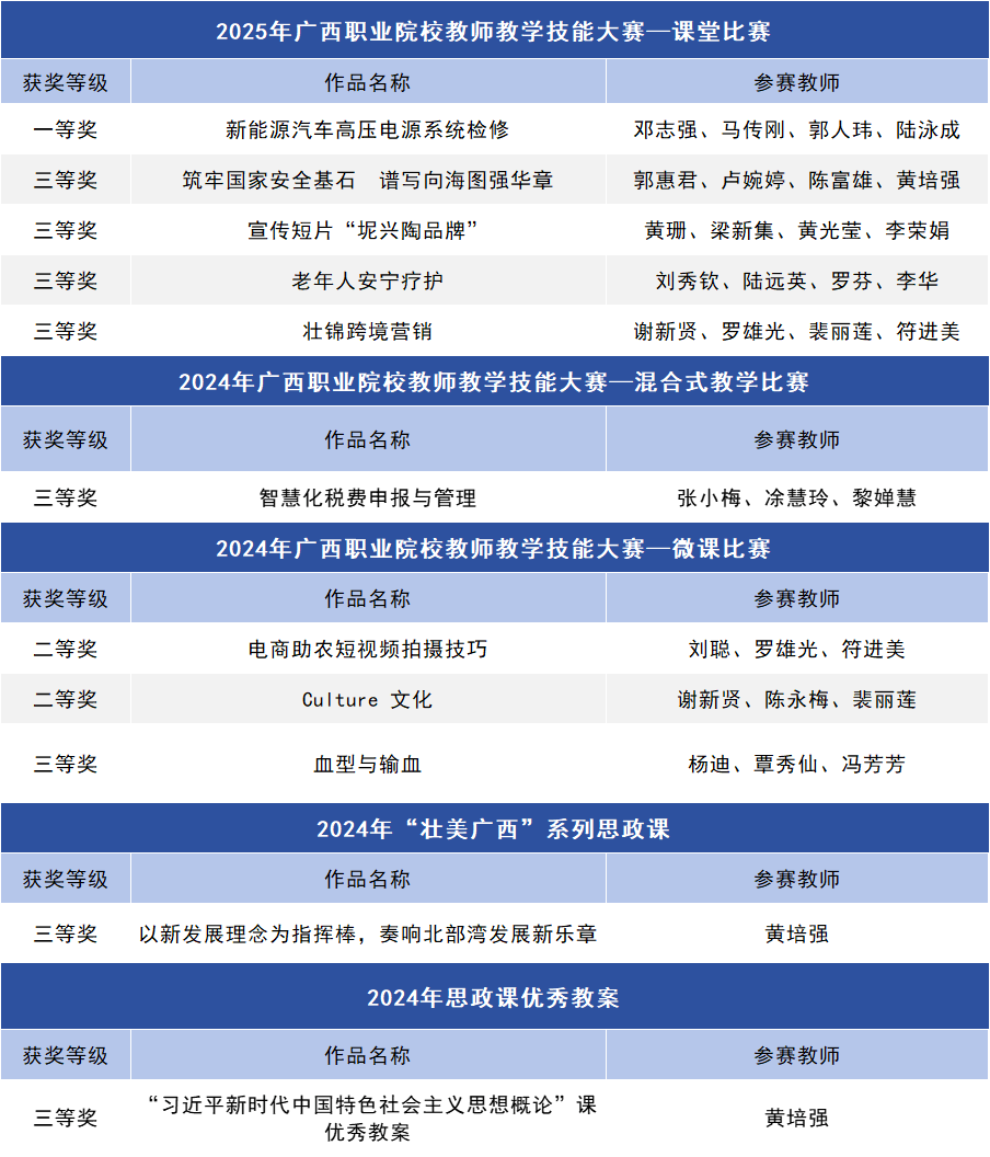 本学年教师团队凭借扎实的专业功底与创新的教学设计,在广西区级赛事中狂揽11项大奖,一等奖1项、二等奖2项、三等奖8项。获奖领域涵盖广西职业院校教师教学技能大赛、“壮美广西”系列思政课以及思政课优秀教案等教学类奖项,全方位展现了我校教师队伍的教学实力与育人水平。