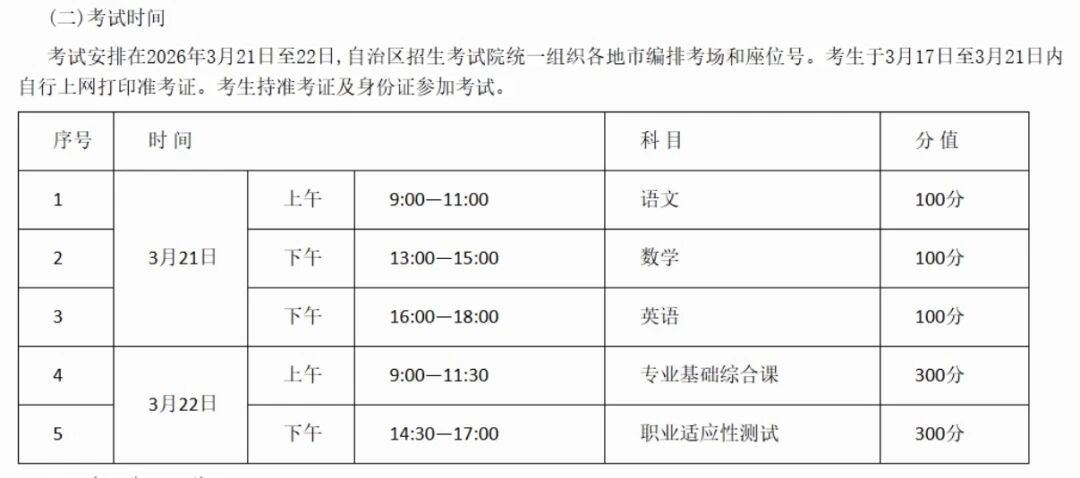 准考证打印:3 月 17 日 - 3 月 21 日(自行登录广西招生考试院官网打印)