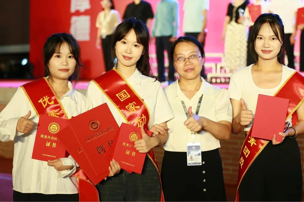 ▲在广西英华国际职业学院“青春光芒万丈 青年挺膺担当”五四表彰大会上,陈永老师与获奖学生合影。