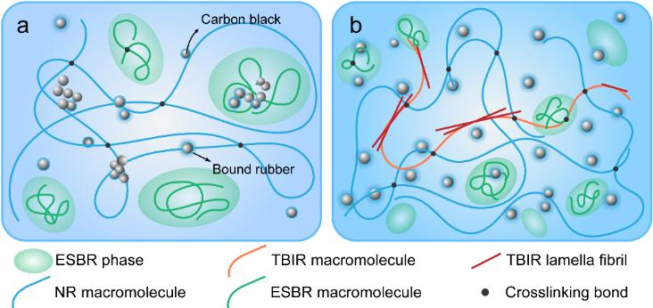本工作开展了NR/ESBR纳米复合材料的填料网络结构及聚合物交联网络结构的调控研究,并重点研究复合材料结构对硫化胶生热、滚动阻力、耐磨性及耐疲劳性的影响。研究发现,添加高反式丁戊共聚橡胶TBIR可以增加NR / ESBR的交联密度,从而减少大分子之间的内部摩擦(图1)。此外,随着TBIR份数增加,NR/ESBR/TBIR并用胶的基体模量增强,有助于抑制室温静置过程和高温硫化过程中的填料聚集,从而改善填料分散性和聚合物-填料-相互作用。此外,TBIR结晶结构在抑制裂纹扩展方面发挥重要作用。因此,加入TBIR的橡胶复合材料可改善橡胶的聚合网络和填料网络,有助于提高耐磨性,减少生热及滚动阻力,并延长疲劳寿命。