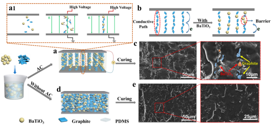 图1. 取向与未取向三相复合材料的制备过程示意图,(a) 交流电场下三相复合材料的自组装过程示意图,(a1) 取向排列的形成机理示意图,(b) 三相取向的机理示意图,(d) 未取向三相复合材料的示意图,(c)和(e) 取向与未取向三相复合材料的扫描电镜图。