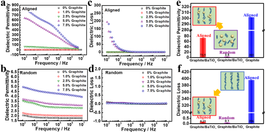 图2. (a)和(b)取向和未取向的三相复合材料介电常数随频率的变化曲线,(c)和(d) 取向和未取向的三相复合材料介电损耗随频率的变化曲线,石墨含量为 2.5 wt%,钛酸钡含量为 5.0 wt%的不同样品在102 Hz下的(e)介电常数和(f)介电损耗。