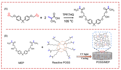 图1. POSS/MEP树脂复合材料制备,(A)端接甲基丙烯酸酯双酚A环氧树脂(MEP)的合成,(B)POSS/MEP复合材料UV固化过程。