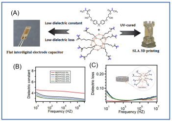 图2. (A)平板叉指电极电容器和3D打印模型,(B、C)POSS/MEP复合材料的介电常数和介电损耗。