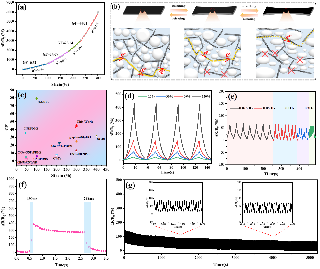图3. (a) rGO/PDMS应变传感器的相对电阻变化与不同线性区域内施加的应变和GF的关系;(b) rGO/PDMS应变传感器在拉伸过程中填料网络的变化示意图;(c) rGO/PDMS传感器的传感性能与文献中报道的柔性应变传感器的比较;(d) rGO/PDMS传感器分别在10%、30%、60%和120%的应变下重复拉伸时相对电阻变化;(e) rGO/PDMS传感器分别在0.025Hz、0.05Hz、0.1Hz和0.2Hz频率下重复30%应变拉伸时的相对电阻变化;(f)快速加载与卸载时相对电阻变化的响应时间;(g) 30%应变下重复加载和卸载时的相对电阻变化。