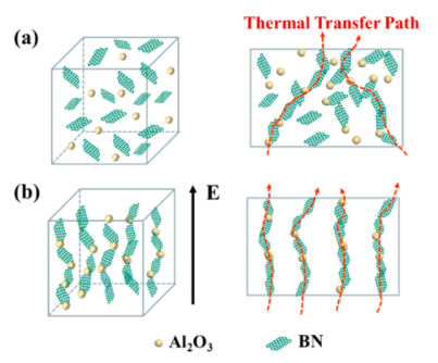 本研究通过场效应的方法在高分子基体中直接实现构筑氧化铝、氮化硼的垂直贯穿导热通道(如图1),制备具有良好导热性能的复合材料。