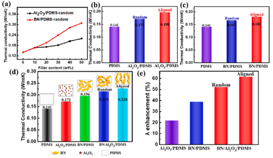 图2 (a)单一填料对导热的影响;(b)和(c)填料取向形成通道对导热的影响:(d)协同效应和导热通道对复合材料的共同影响;(e)导热率的提升百分比。