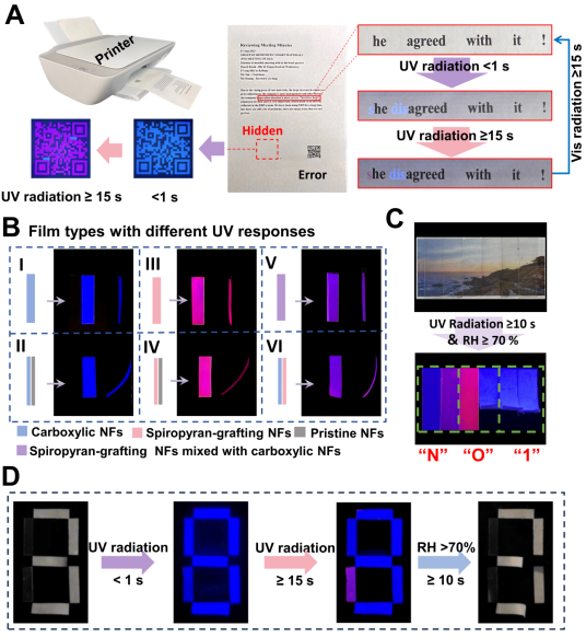 此外,结合前面所制备生物质纳米原纤维以及羧基化纳米纤维,采用逐层抽滤的方法制备了具有多层异质结构的生物质纳米纤维薄膜。通过SEM表征该纳米纤维薄膜厚度在260nm,能够在环境湿度为70%的条件,通过紫外光和可见光切换完成多次循环弯曲致动,具备良好的光致致动特性。因此,团队尝试将这种多层异质薄膜用于信息加密领域,通过打印可以完成多重伪信息加密,并通过将螺吡喃纳米纤维与羧基化纳米纤维进行单层或多层抽滤组合,构成6种不同变色和致动行为的单层或多层薄膜,这些薄膜两两组合可以满足字母a-z以及数字0-9的编码加密。最后,利用薄膜光响应和湿气响应性尝试去建立一种新的信息加密手段,实现三维信息加密。通过薄膜的变色和致动行为,将信息从初始的数字3经历8 9最终变化为7。