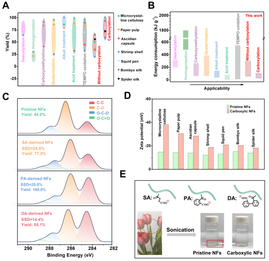 近日,青岛科技大学张建明团队陈玉伟副教授与中国科学院青岛能源所李朝旭研究员等合作开发了一种具有普适性的生物质纳米纤维绿色制备方法。该制备方法主要利用1,8-二氮杂双环[5.4.0]十一碳-7-烯(DBU)的二甲亚砜(DMSO)作为一种通用的、可回收的、非侵入性的去质子化溶剂体系,对不同多糖或氨基酸基生物质材料进行夺质子化处理,并配合后期高压均质等强物理剪切作用制备生物质纳米原纤维。同时,依赖于DBU的酯化催化特性,该溶剂体系还可以活化生物质表面羟基,促进其与酸酐反应制备羧基化纳米纤维。