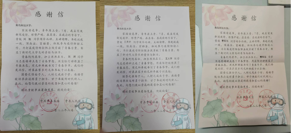 青岛科技大学高分子学院接连收到了三封分别来自曹县人民政府的感谢信,在信中高度赞扬了三位同学无私奉献的志愿精神,同时对学校育人成果给予充分肯定。作为青年大学生,他们不惧风雨,勇挑重担,在疫情防控阻击战中做贡献、长本领、增才干,让青春在党和人民需要的地方绽放绚烂之花。