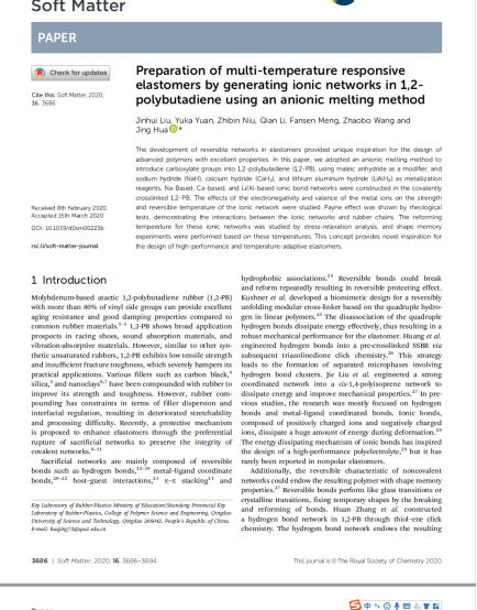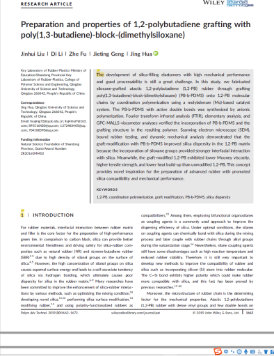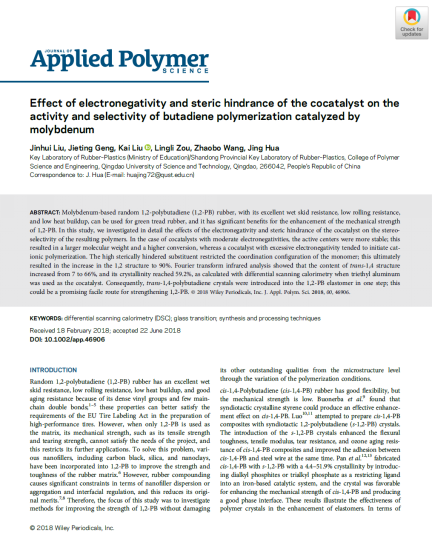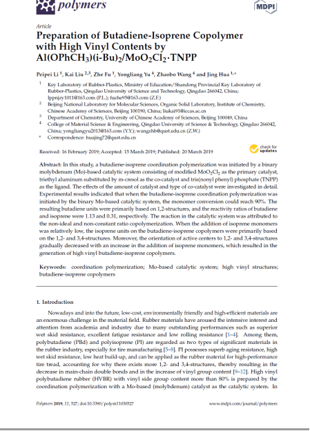 1.成果1:(简要介绍成果名称、完成人、内容、获奖(出版、发表)和应用成效等情况,限200字以内,并在结尾处标注“证明材料”页码,下同) ……主要研究高分子材料的合成、结构与性能,功能高分子材料及分子化学工程。突出高分子合成及橡胶工程研究特色,围绕本领域关键性、基础性课题积极开展创新性研究,包括双烯烃橡胶的合成(高乙烯基聚丁二烯、稀土异戊橡胶、稀土顺丁橡胶等的结构设计):包括催化剂制备、聚合物结构控制、结构测试表征、加工流变性、物理力学以及应用配方;另外,橡胶的功能化研究:有机无机杂化材料的制备和性能研究。发表相关论文,如下: 1. SCI论文,Yang Liu,Qiu Han, Tiantain Li, Jing Hua, Fu Liu, Qiang Li d, Gang Deng. Heparin reduced dialysis through a facile anti-coagulant coating on flat and hollow fiber membranes. Journal of Membrane Science,2019(1区),证明材料页码7 2. SCI论文,Jinhui Liu, Yuka Yuan, Zhibin Niu, Qian Li, Fansen Meng, Zhaobo Wang and Jing Hua. Preparation of multi-temperature responsive elastomers by generating ionic networks in 1,2-polybutadi. Soft Matter, 2020, 16, 3686—3694(2区)明材料页码7 3. SCI论文,Jinhui Liu, Di Li, Xiangshuai Zhao, Jieting Geng, Jing Hua * and Xin Wang. Buildup of Multi-Ionic Supramolecular Network Facilitated by In-Situ Intercalated Organic Montmorill,Polymers 2019, 11, 492(2区)明材料页码8 4. SCI论文,Peipei Li, Kai Liu, Zhe Fu, Yongliang Yu, Zhaobo Wang, Jing Hua. Preparation of Butadiene-Isoprene Copolymer with High Vinyl Contents by Al(OPhCH₃)(i-Bu)₂MoO₂Cl₂ TNP. Polymers 2019, 11, 527(2区) 明材料页码8 5. SCI论文,Kai Liu, Qingqing Lv, Jing Hua*. Study on damping properties of HVBREVM blends prepared by in situ polymerization. Polymer Testing 60 (2017) 321e325(2区)明材料页码9 6. SCI论文,Jing Hua∗ Kai Liu, Jinhui Liu, Xiangshuai Zhao, Zhaobo Wang. Low-crosslinking multi-functionalization HVBR prepared in solvent free process by anionic grafted reaction. Polymer Testing 66 (2018) 342–349(2区)明材料页码9 7. SCI论文,Jinhui Liu, Jieting Geng, Kai Liu , Lingli Zou, Zhaobo Wang, Jing Hua. Effect of electronegativity and steric hindrance of the cocatalyst on the activity and selectivity of butadiene polymerization catalyzed by molybdenum. J. APPL. POLYM. SCI. 2018, 46906,(3区)明材料页码10 8. SCI论文,Jinhui Liu, Di Li,Zhe Fu, Jieting Geng, Jing Hua. Preparation and Properties of 1,2-polybutadiene Grafting with Poly(1,3-butadiene)-block- (dimethylsiloxane). Polym Adv Technol. 2019;30:1663–1672.(3区) 明材料页码10 9. SCI论文,Jing Hua, Kai Liu , Zhaobo Wang, Jieting Geng, Xin Wang. Effect of vinyl and phenyl group content on the physical and dynamic mechanical properties of HVBR and SSBR. J. APPL. POLYM. SCI. 2017 (3区). 明材料页码11 10. SCI论文,Di Li,Kai Liu,Jian Tang, Zixu Cui, Jing Hua. Preparation of high 1,2-orientation butadiene-styrene copolymer by coordination copolymerization with molybdenum-based catalytic system. J. APPL. POLYM. SCI. 2020(3区)明材料页码11