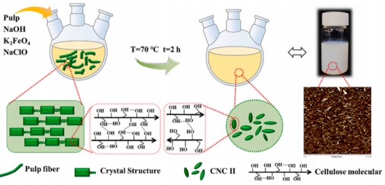 随着高科技产业对绿色材料需求的增加,纤维素纳米晶体(CNCs)作为一种天然纳米材料,因其独特的结构和优异的性能备受关注,其中,CNC Ⅱ因具有较高的热稳定性和乳化能力,在纳米复合材料领域展现出巨大潜力。然而,传统制备方法复杂且易造成环境污染。青岛科技大学周立娟/张建明研究团队进行了关于Ⅱ型纤维素纳米晶体(CNC Ⅱ)制备的创新研究。研究团队创新性地提出了一锅法制备CNCⅡ的新策略,优化了反应条件,确定了最佳工艺参数,利用高铁酸钾(K2FeO4)在碱性环境下的强氧化性,结合少量次氯酸钠(NaClO),在5M氢氧化钠(NaOH)溶液中,实现了从棉浆到CNCⅡ的一步高效转化。制备的CNC II呈“棒状”形态,平均宽度约7nm,长度约269nm。X射线衍射(XRD)和拉曼光谱分析证实了CNC II的成功制备,且其结晶度指数高达71.4%。热重分析(TGA)显示,CNC II的热稳定性优异,起始降解温度超过310°C。该方法不仅简化了制备流程,减少了环境污染,还显著提高了产率,最大可达45.14%。研究还发现,CNC II在无需表面活性剂的情况下,能有效稳定高内相Pickering乳液,为食品、化妆品和制药等工业领域提供了新的应用可能。这一研究成果不仅为CNC II的大规模制备提供了绿色、高效的新方法,还推动了其在高附加值纳米复合材料领域的应用,展现了广阔的应用前景和科研价值。