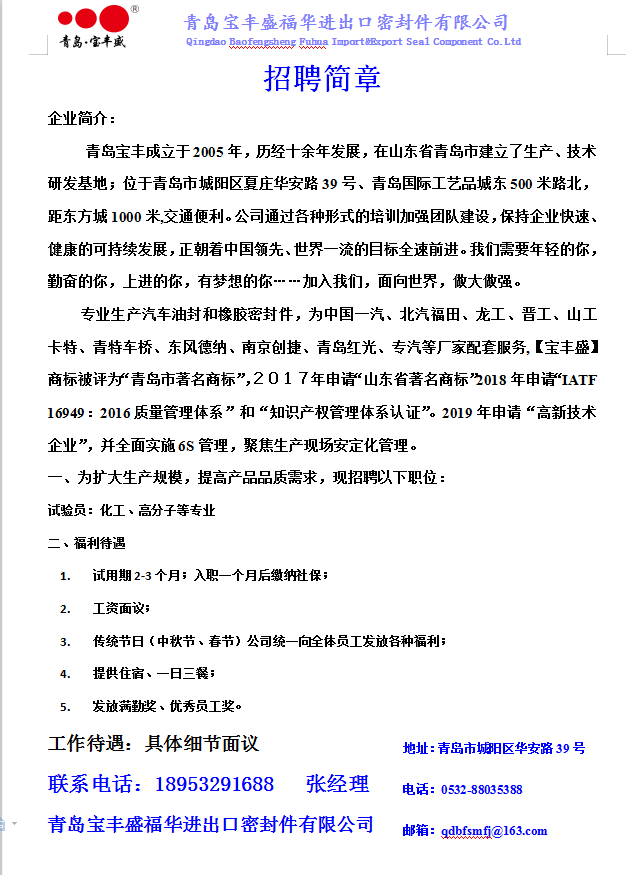 青岛宝丰盛福华进出口密封件有限公司-2020高分子招聘之九十