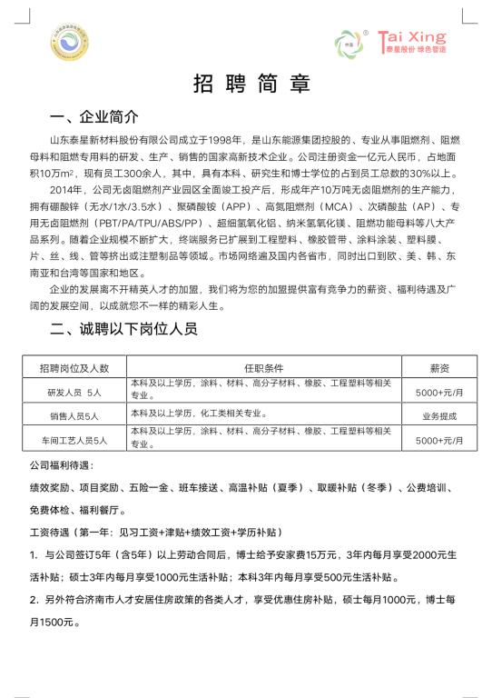 山东泰星新材料股份有限公司-2020高分子招聘之一百三十九