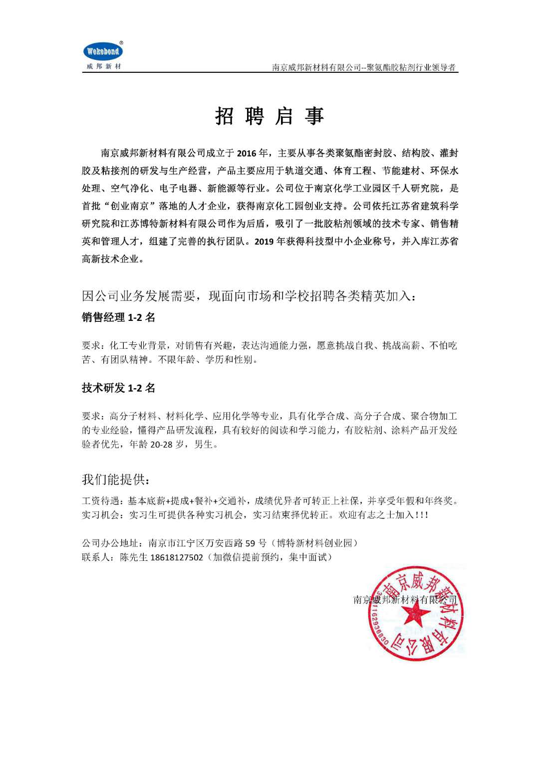 【就业信息】南京威邦新材料有限公司招聘简章