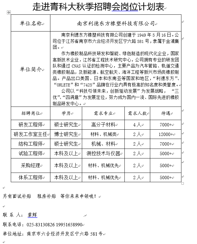 【就业信息】南京利德东方橡塑科技有限公司招聘简章