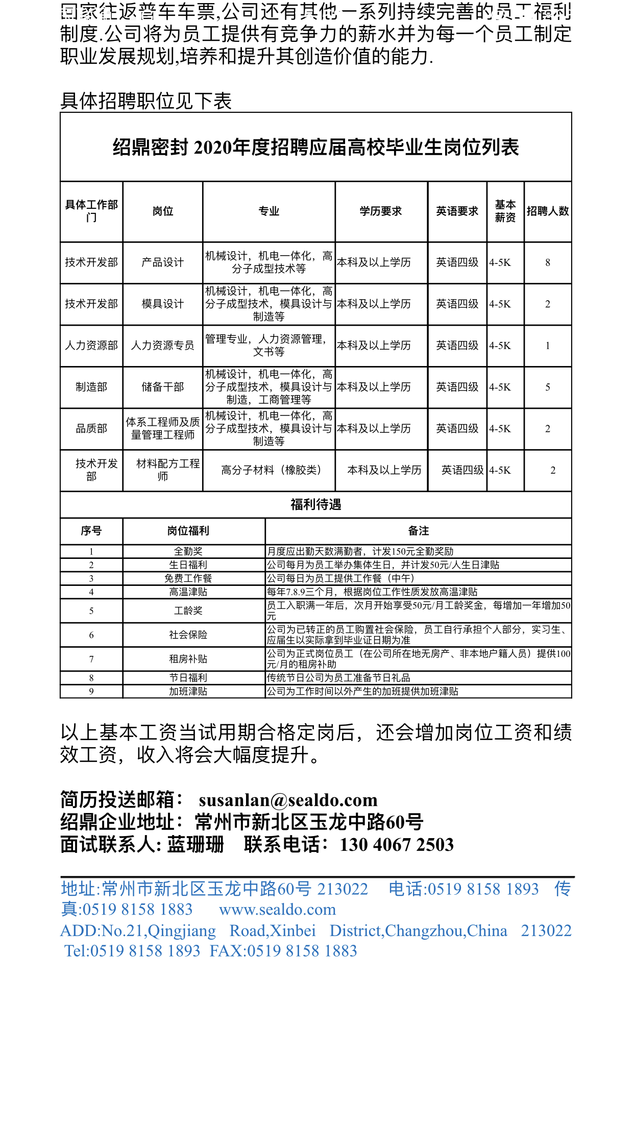 【就业信息】常州绍鼎密封科技有限公司招聘简章