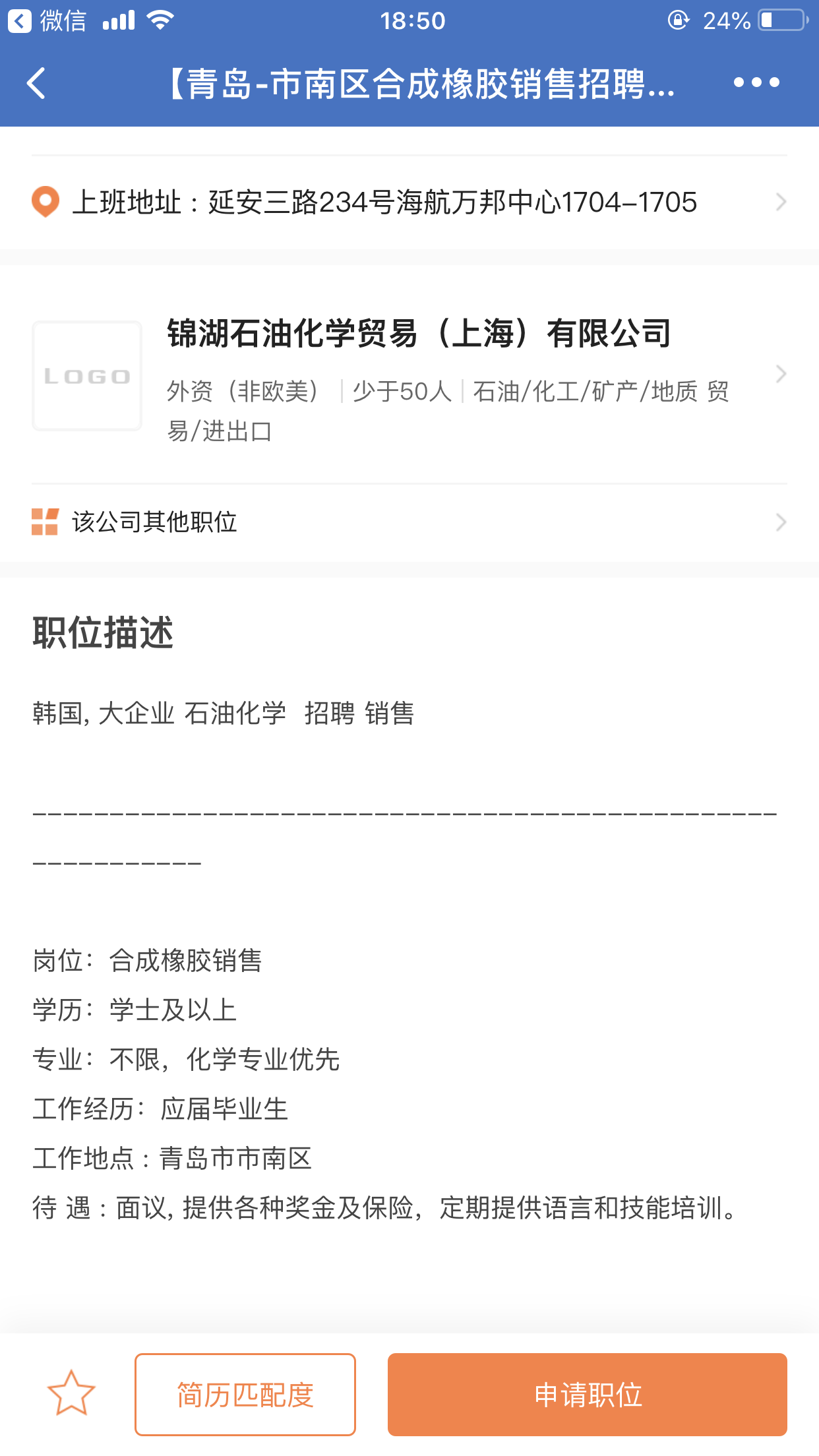 【就业信息】锦湖石油化学贸易(上海)有限公司招聘简章