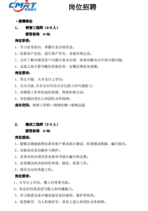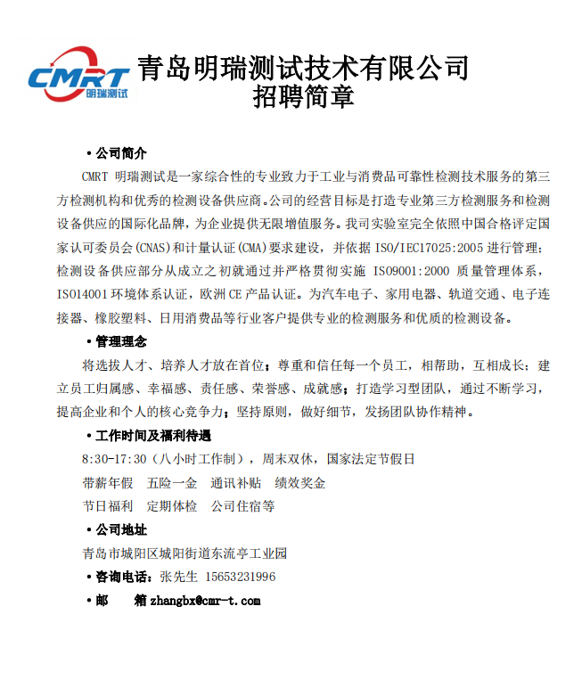 【就业信息】明瑞测试技术有限公司招聘简章