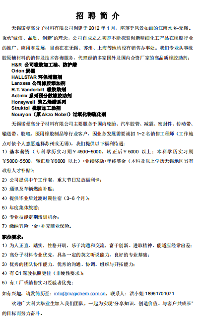 【就业信息】无锡诺曼高分子材料有限公司招聘简章