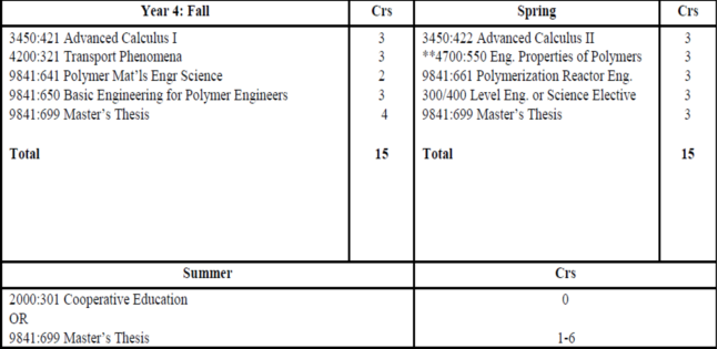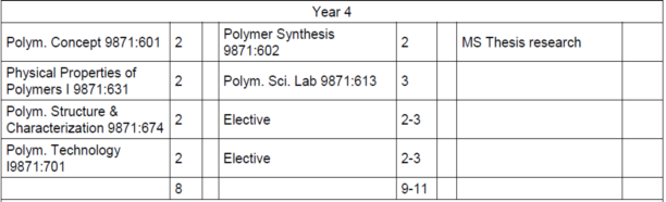 第4年要完成课程学分23个学分(不包括论文研究学分)。课程分别是:高级微积分I,高级微积分II,传输现象,聚合物材料工程科学,基本聚合物工程,聚合物工程性能,聚合反应工程,选修课一门(科学或工程)。