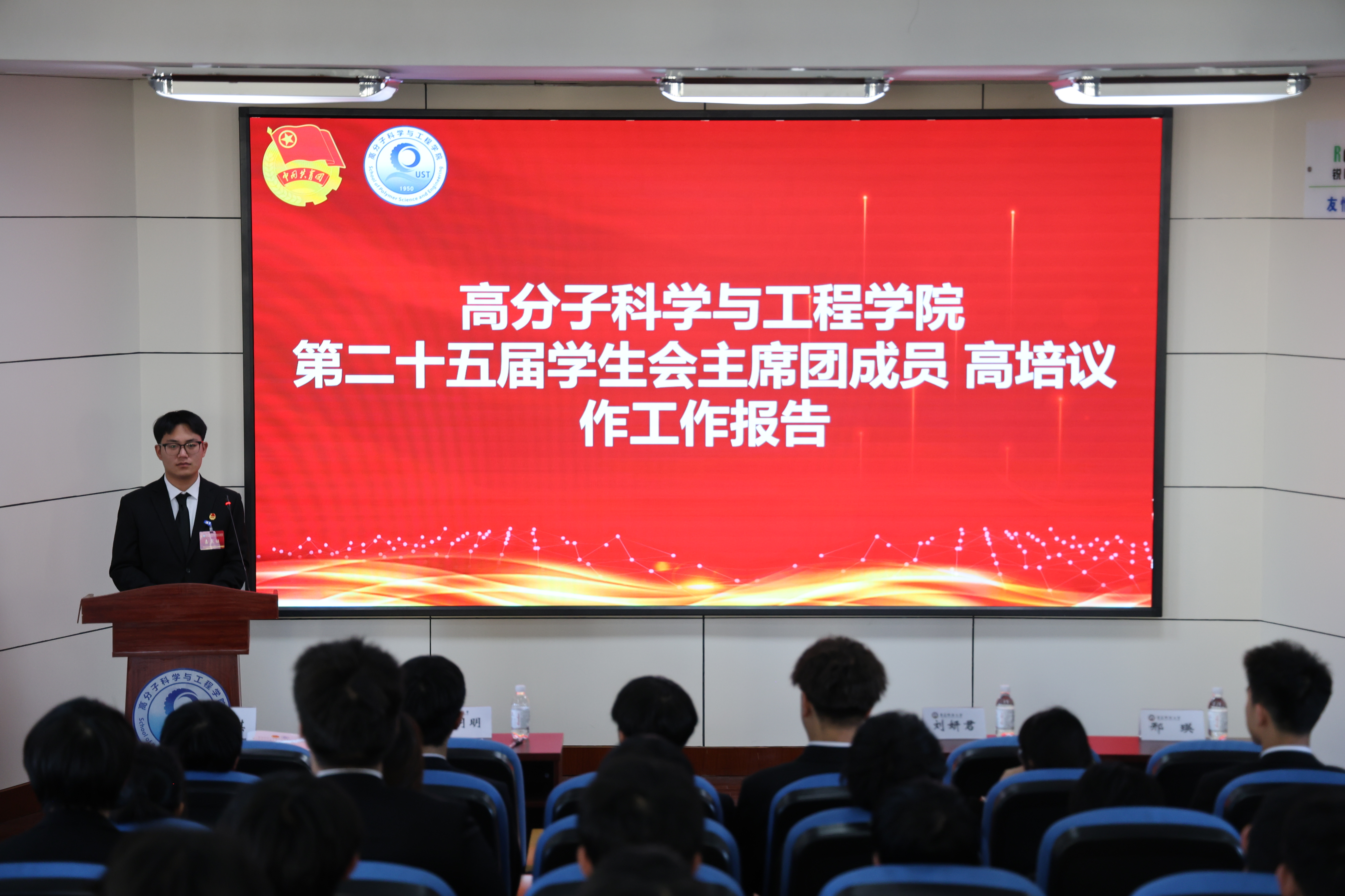第一次全体会议第二阶段,大会听取、审议并通过高培议同学代表青岛科技大学高分子科学与工程学院第二十五届学生委员会做《守正创新不忘“橡尚本色”,挺膺担当砥砺青春征程》的工作报告。
