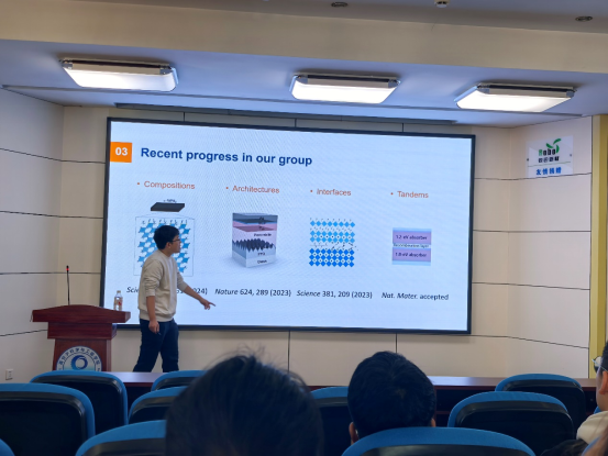 会上魏教授结合自己的科研经历,讲述了使用二维/三维异质结构来改善窄带隙钙钛矿界面,最终制备了创纪录效率的全钙钛矿串联太阳能电池。这一成果不仅为钙钛矿太阳能电池的商业化应用奠定了坚实基础,也为其他新型光伏技术的发展提供了有益借鉴。同时魏教授谈到下一代技术的商业化需要对稳定性和可扩展性进行突破性的创新解决方案。在这方面,为集成不同半导体的新型混合异质结构可以提供了克服现有材料系统限制的方法。我院相关专业的研究生参会并对相关问题进行了咨询和讨论,现场气氛热烈。
