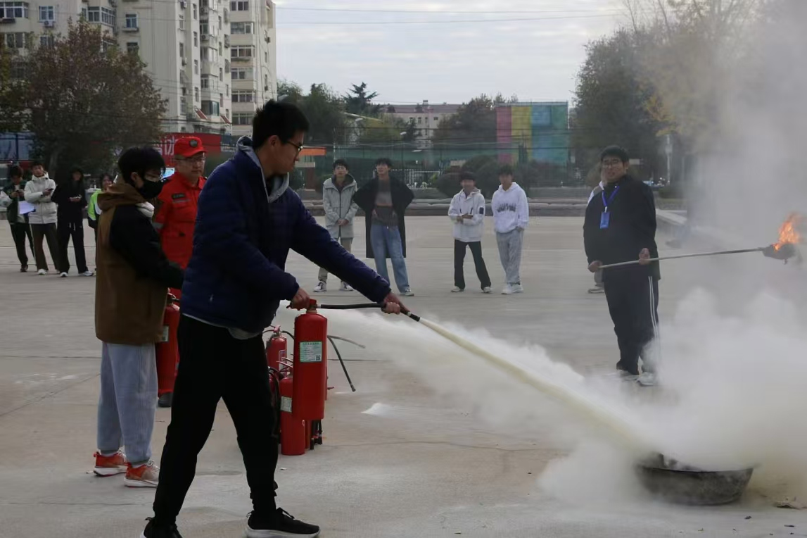 疏散完成后,仇立峰老师为师生们讲解了灭火器材的用途和使用方法,各班同学仔细观摩并选派代表参与体验,在“提—拔—握—压”的灭火器规范化使用流程下,将燃烧的火焰迅速熄灭。学生们认真学习,积极参与灭火实践,有效提升了扑救初期火灾的能力。