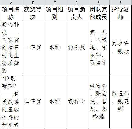 由刘夕升、张欣老师指导,初浩展等同学参与的项目《凝心科技——全球首创秸秆转化生物质凝胶》获比赛一等奖,也是我校唯一一个一等奖;由陈玉伟、张建明老师指导,袁称心等同学参与的项目《“传动新声”——超灵敏柔性压敏材料的开拓者》获比赛二等奖;由刘锦春老师指导,李廷廷等同学参与的项目《因材施矫--形状记忆聚氨酯智能材料的医疗应用》获比赛三等奖。本次比赛学校共获得一等奖1项,二等奖6项,三等奖11项。