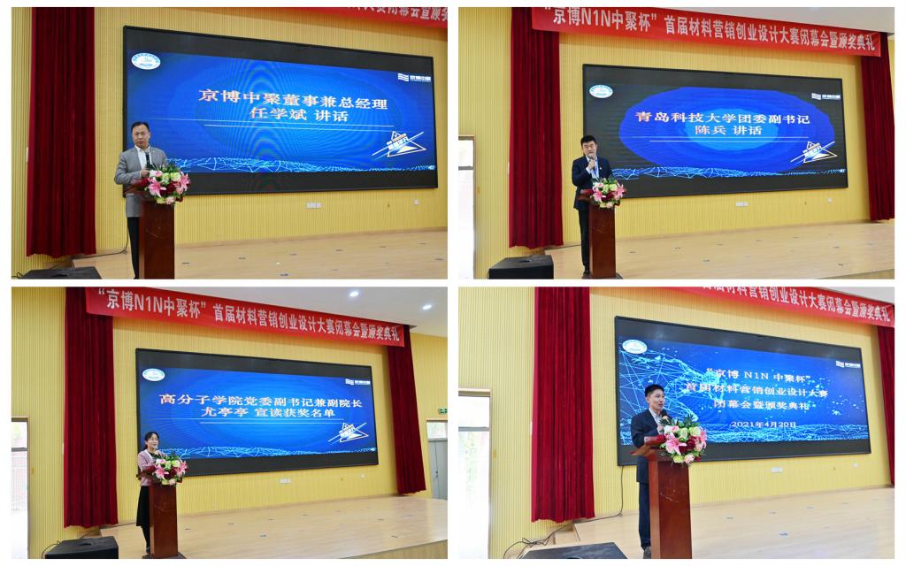 4月20日,“京博N1N中聚杯”首届材料营销创业设计大赛闭幕式暨颁奖典礼在青科大四方校区举行。青岛科技大学团委副书记陈兵、高分子学院党委副书记兼副院长尤亭亭,山东京博中聚新材料有限公司董事兼总经理任学斌及高分子学院团委、经管学院团委、京博中聚相关负责人参加颁奖典礼。高分子学院团委书记贾明明主持颁奖典礼。