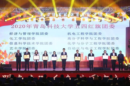 4月27日晚,青岛科技大学“永远跟党走”学党史庆五四红色校园文化展演活动在四方校区西礼堂举行。会上对2020年度“五四红旗团委”进行表彰,高分子学院团委获评学校2020年度“五四红旗团委”荣誉称号。学校党委常委、副校长李勇、吕万翔为获奖学院代表颁奖。
