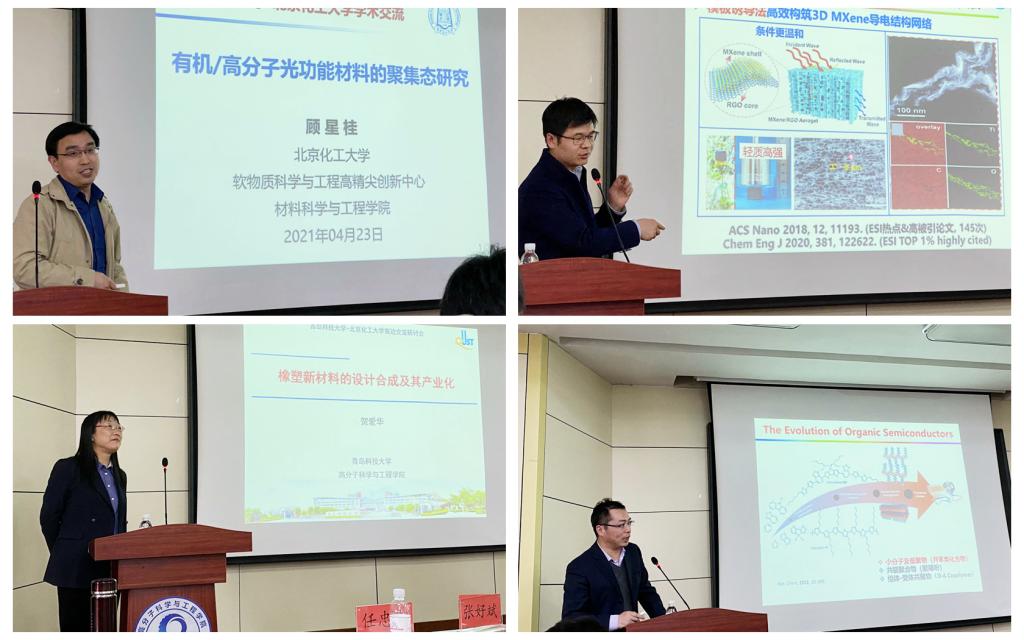 会上来自北京化工大学的优秀青年学者国家优青任忠杰、张好斌教授、青年千人顾星桂、张磊、周伟东教授分别做了橡塑复合材料、有机光电材料、电磁屏蔽复合材料等相关研究领域的学术报告,我校高分子学院青年学者贺爱华、赵英杰教授,材料学院青年学者汪恕欣、袁勋教授也就橡胶材料的合成及产业化、高分子材料能源转换、金属纳米团簇等研究领域的工作做了报告。会议期间来自两个学校的老师在展示已有工作的基础上,针对相关学科领域的发展趋势和前沿展开了讨论,促进了学科的交流与合作。
