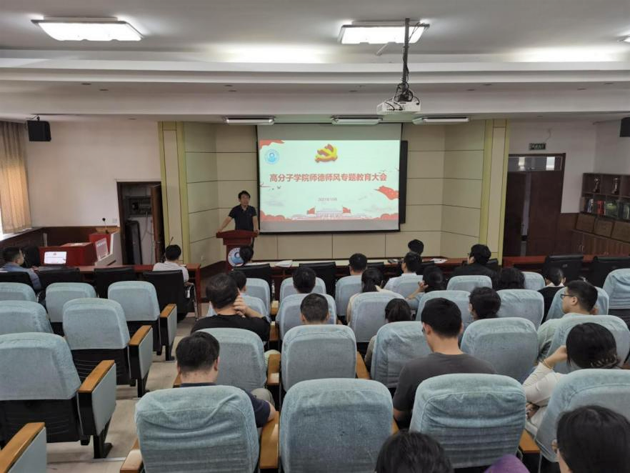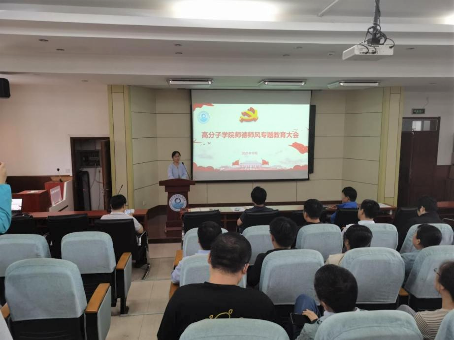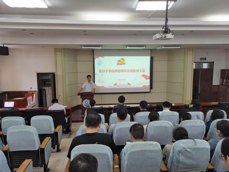 为深入学习贯彻习近平总书记关于教育的重要论述,常态化推进学院教师的师德涵养培育,10月7日,高分子学院“教书育人、师德为先”师德师风建设专题教育大会在学院阿朗新科报告厅举行。学院党政领导闫业海、孙洪广、王庆富、尤亭亭,全体青年教师参会。副院长王庆富主持会议。